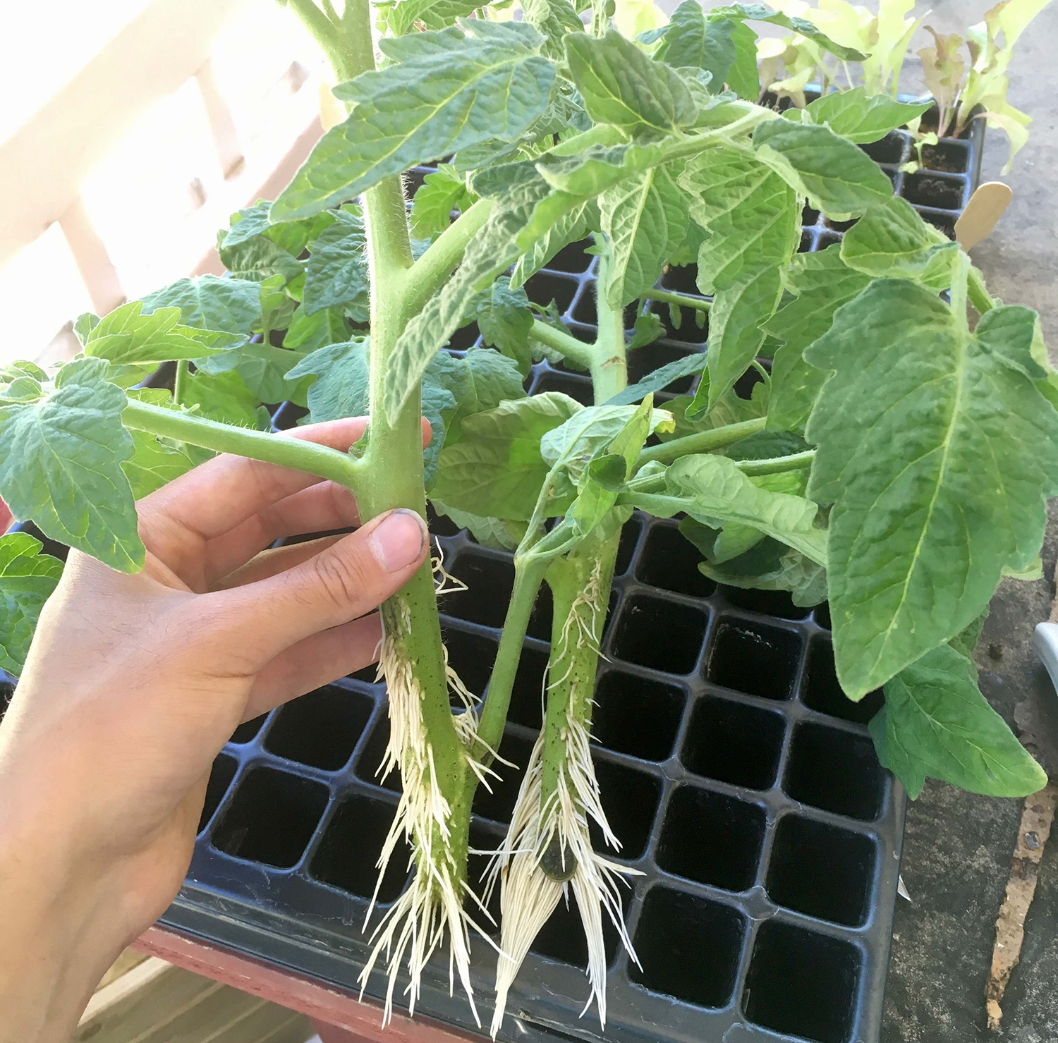 Just use the same method of making cuttings, as above just that instead of putting them directly into soil, place the cuttings in water to let them root here first. This way you can also root bigger plants that might take longer to root in soil. You simply put the tomato cuttings in a glass or a vase of water where roots are formed and then you plant them into pots of soil. It's faster to put them in soil directly, but if you do not think you will be able to water daily, the water method is a good option that I used myself. Just refill when the plant is drinking or the water evaporates. After a while, a lot of roots have been formed on the stem and your tomato plants might look like these: