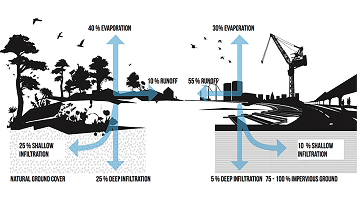The vegetation on the roofs, walls and ground play a vital role in the prevention of floodings even in small scale. The plants absorb the water and slowly release it through evaporation. However, how good the planting beds can absorb the water is depending on a range of different factors such as vegetation, climate and soil. As an example a thin sedum roof can almost half the stormwater runoff on a yearly basis while a roof of 5 cm thickness can reduce as much as 70 % of the stormwater according to FLL. In the image under, made by Hanna Johansson, former architect at The Foodprint Lab, you can see how big difference it is between infiltration of stormwater in asphalted urban areas and areas with more vegetation.