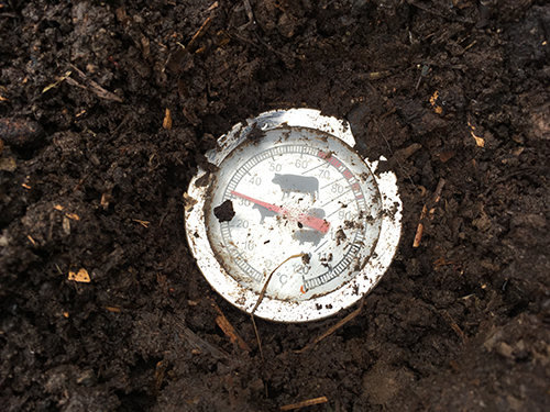 4. Time to place a thermometer in the set-up to follow any temperature change. This is the fun part! Place the monitor of the digital thermometer outside of the hotbed, and insert the temperature-measuring end of the thermometer into the hotbed. Note: Do not place the monitor inside the hotbed, as condensation can destroy the apparatus. The composting process has begun when you notice any temperature increase.